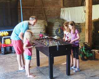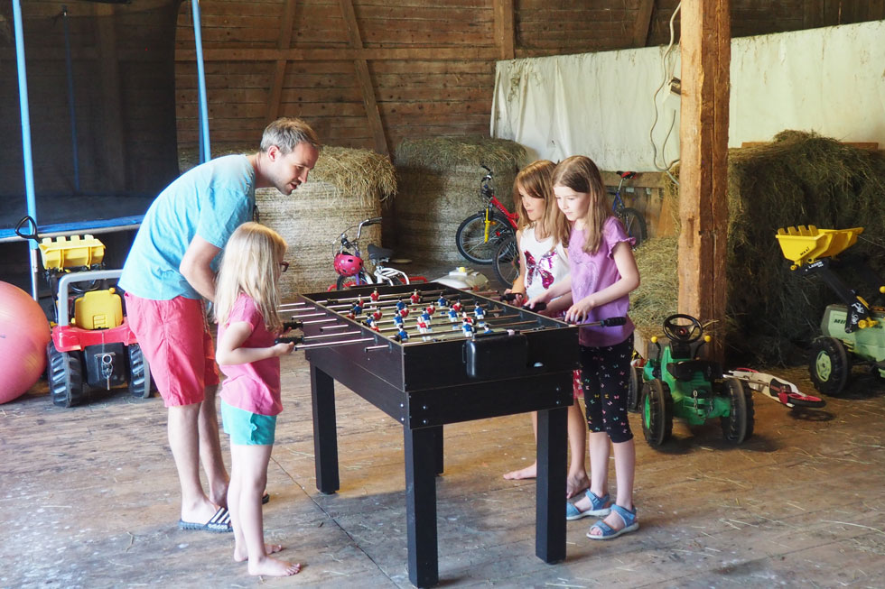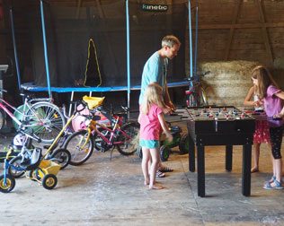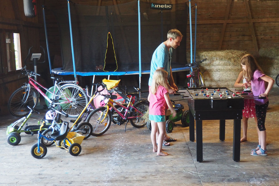 Ein sehr häufig genutzter Platz - nicht nur bei Regentagen - ist unsere "Tenne". Hier können Ihre Kinder Fußballkicker, Tischtennis und Kegel spielen. Auch mit den Kindertraktoren kann hier wunderbar gefahren werden. Ein großes Trampolin ist ebenfalls vorhanden.